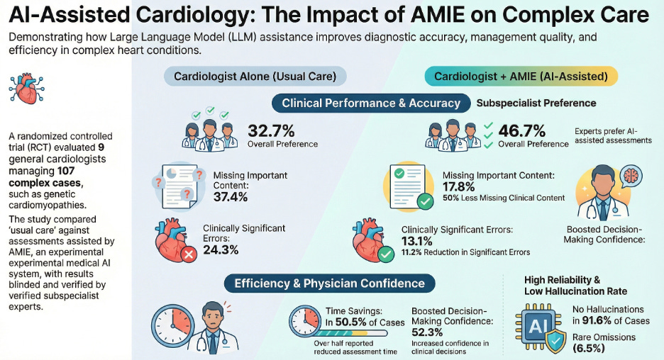 The trial centered on a whether an AI “co-pilot” could elevate a general cardiologist to the performance level of a world-class subspecialist. They used the Gemini 2.0 Flash architecture. Rather than relying on expensive fine-tuning, the researchers refined AMIE for this complex domain using just nine initial cases. Then, armed with this rapidly acquired expertise, nine general cardiologists managed 107 real-world cases involving a dense data stack of text reports from ECGs, echocardiograms, cardiac MRIs, and cardiopulmonary exercise testing. Statistically, when blinded subspecialists reviewed the results, they preferred the AI-assisted assessments in 46.7% of cases, compared to just 32.7% for cardiologists working alone. The subspecialists noted that the AI-assisted plans were significantly more comprehensive and better at incorporating modern diagnostics and advanced therapeutic interventions. As the World Health Organization warns of a collapsing global infrastructure. It predicts a deficit of 18 million providers by 2030. This disparity is further exacerbated for rarer and more complex conditions, particularly those for which timely treatment prevents morbidity and mortality. What is truly remarkable is the data from this randomized controlled trial, which show that an unassisted human baseline where cardiologists had a clinically significant error rate of 24.3%. With AMIE’s assistance, however, that rate was nearly halved to 13.1%. Perhaps even most importantly for the future of the medical workforce, the AI did not usurp the physicians, but enhanced them. This suggests that AI, rather than threatening professional ego, actually helps clinicians reclaim their cognitive margin by handling the exhausting work of data synthesis.